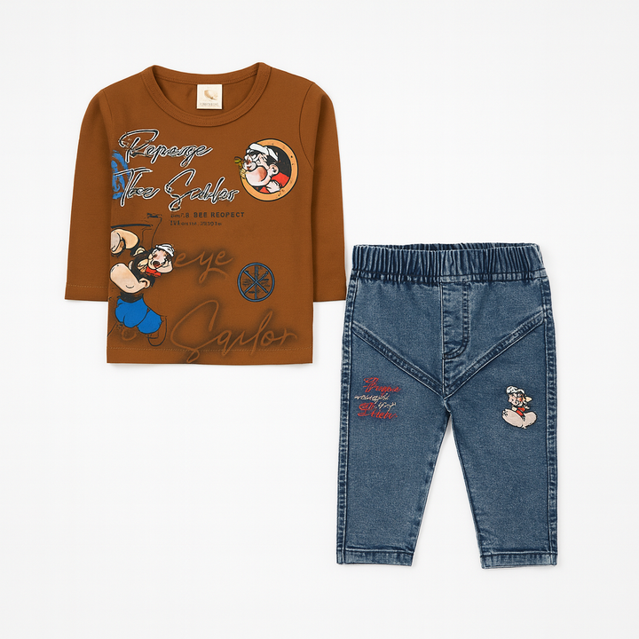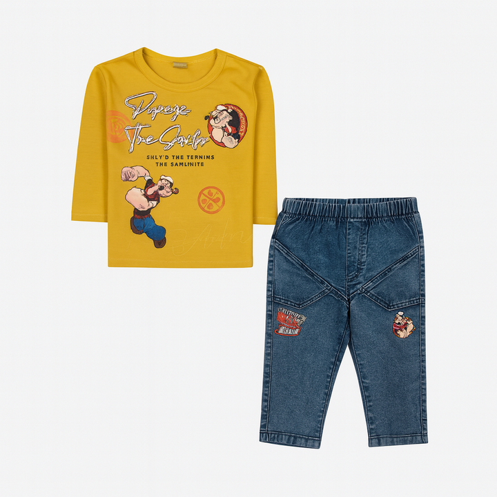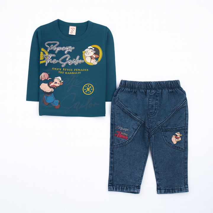 Bring fun and adventure to your little one’s wardrobe with this “Popeye The Sailor” printed outfit set. The dark teal full-sleeve t-shirt features colorful Popeye graphics and stylish text, giving it a cool and playful vibe. Paired with denim-look trousers featuring matching embroidered patches and deep utility-style pockets, this set is both trendy and comfortable.