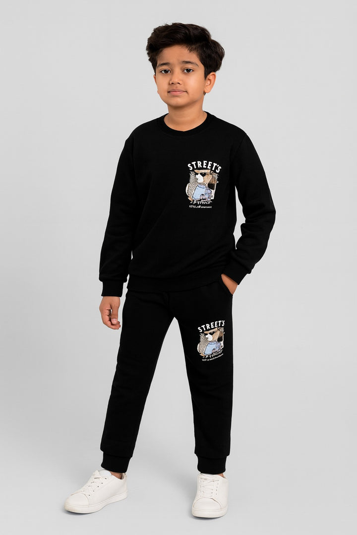 Keep your little one warm and stylish this season with our premium black “STREETS” printed tracksuit. Crafted from soft, cozy fleece fabric, this two-piece set includes a full-sleeve sweatshirt and matching jogger pants featuring trendy street-style bear graphics on both pieces.