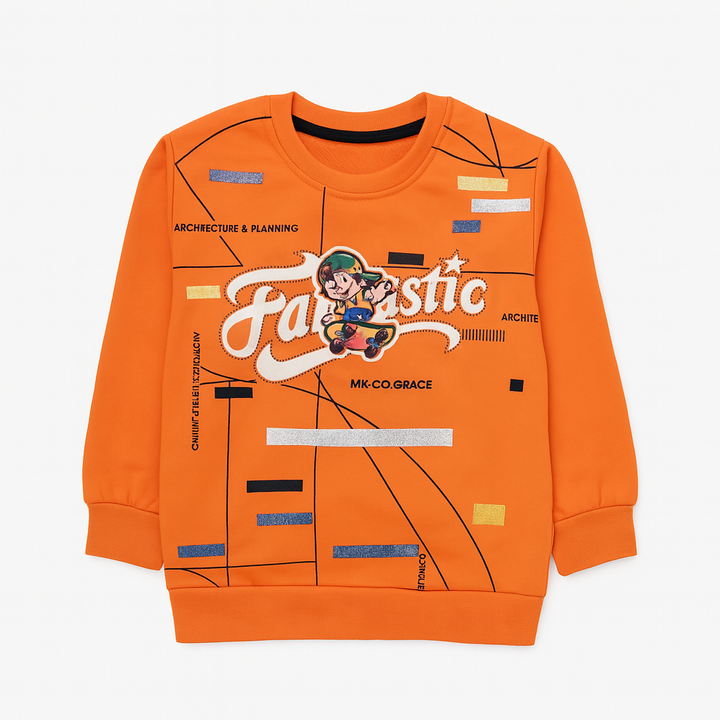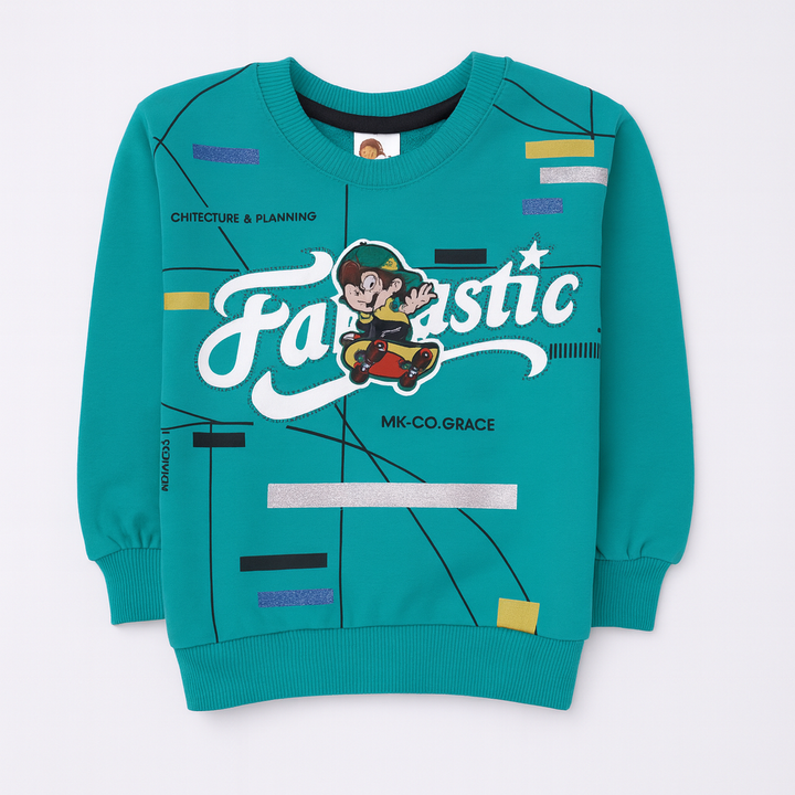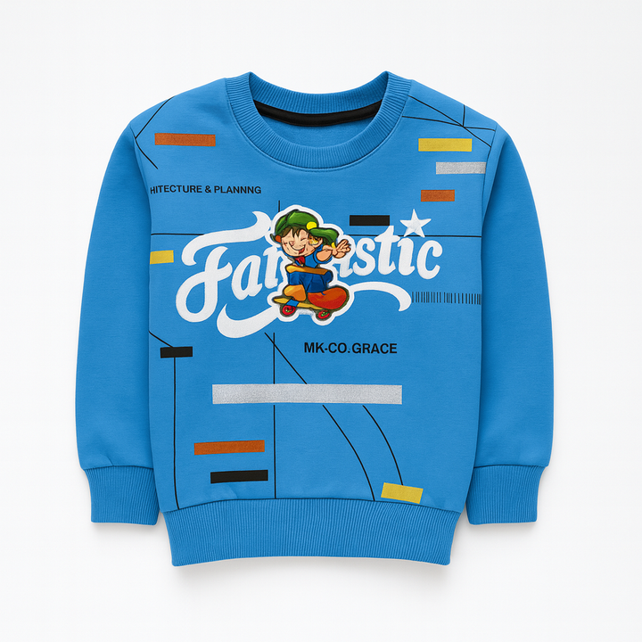 👕 Top: Blue sweatshirt with “Fantastic” print and cartoon patch