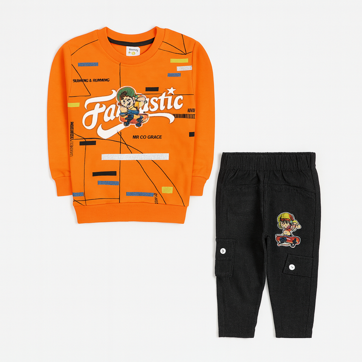 Add a pop of color and fun to your little boy’s wardrobe with this stylish two-piece outfit set. The bright blue sweatshirt features a playful cartoon graphic with “Fantastic” text print, giving it a cool and energetic vibe. Paired with comfortable black cargo pants detailed with matching cartoon embroidery and buttoned side pockets, this outfit is perfect for both playtime and casual outings.