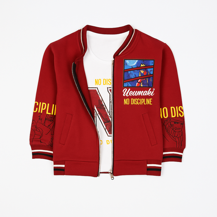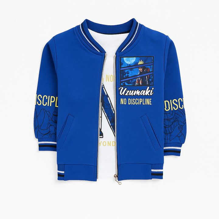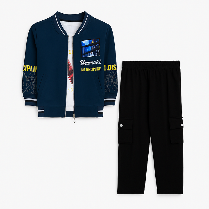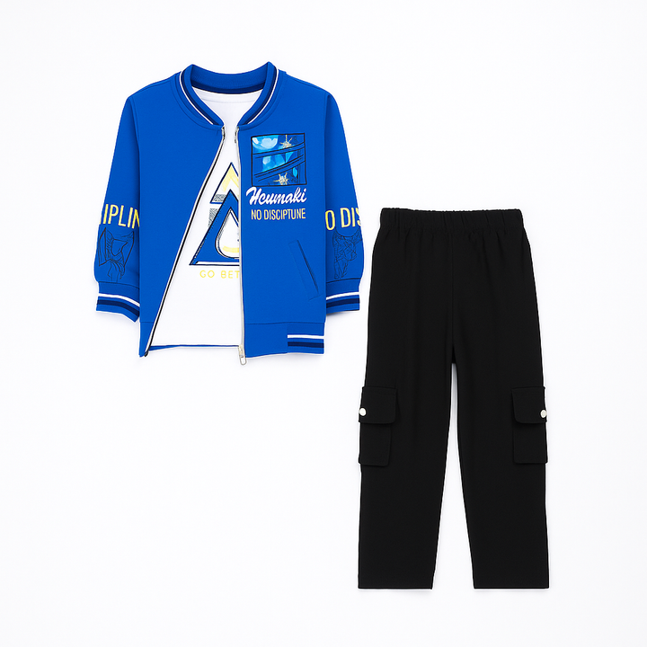 Let your little champ step out in cool confidence with this trendy 3-piece boys outfit, featuring a royal blue jacket, graphic white T-shirt, and black cargo-style pants. The sporty jacket comes with bold “No Discipline” text prints and contrast striped cuffs for a smart look. Perfect for casual outings, playdates, or school wear, this set offers both comfort and street-style flair.