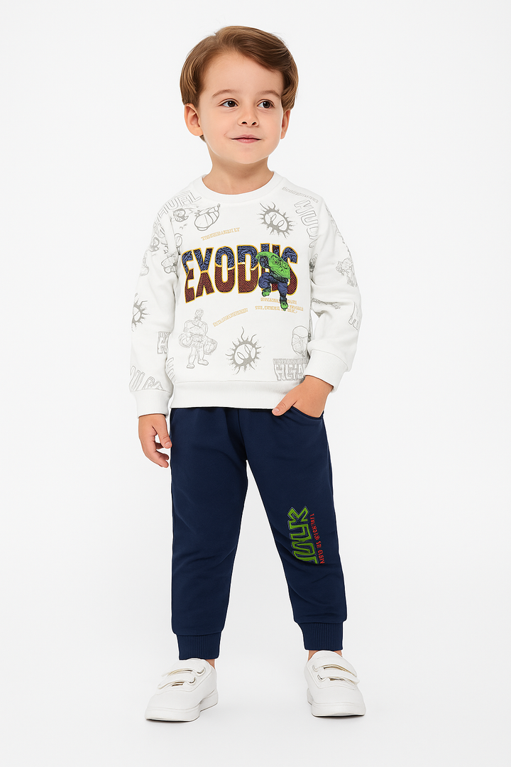 Let your little superhero stay warm and stylish with this trendy “Exodus Hulk” sweatshirt and jogger set. The navy blue sweatshirt features a bold Hulk fist graphic and textured “Exodus” lettering for a cool, powerful look, while the light grey jogger pants add comfort and contrast with a matching “Hulk” print detail. Made from premium soft fleece fabric, this set ensures warmth, flexibility, and durability—perfect for school, playtime, or weekend adventures!