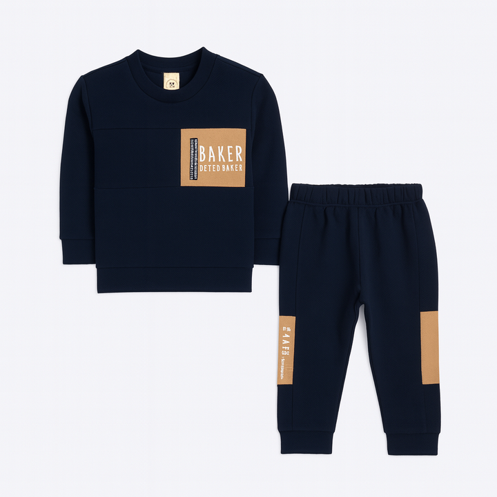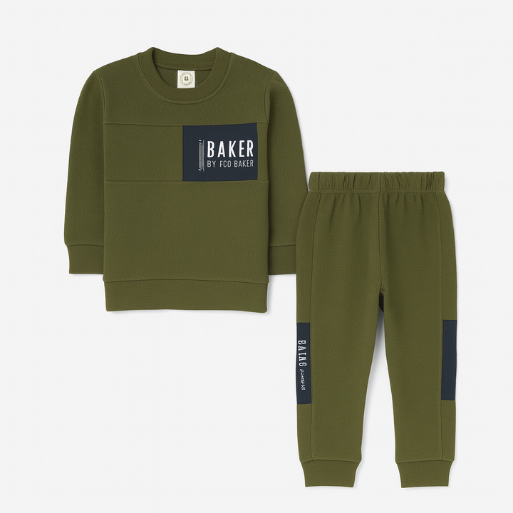 Keep your little one looking stylish and comfy with this Olive Green “BAKER” Co-Ord Set. Crafted from soft, textured fabric, this outfit features a trendy sweatshirt with a bold black patch and “BAKER BY FCO BAKER” print on the chest, paired with matching jogger trousers that have side panel detailing.