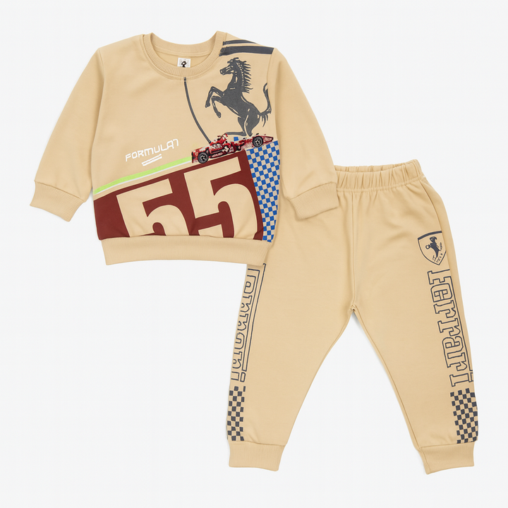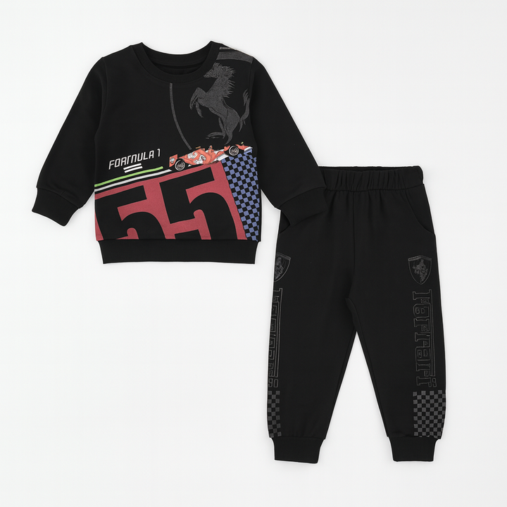 Rev up your little racer’s style with this Formula-1 inspired sweatshirt and jogger set! Made from soft, breathable cotton blend fabric, this set ensures all-day comfort and warmth. The sweatshirt features a bold race car print, number “55” graphic, and Ferrari-style horse emblem, bringing sporty energy to your child’s wardrobe. Paired with matching jogger pants featuring an elastic waistband and ribbed cuffs for a snug, comfy fit.