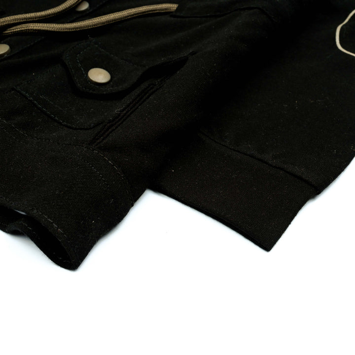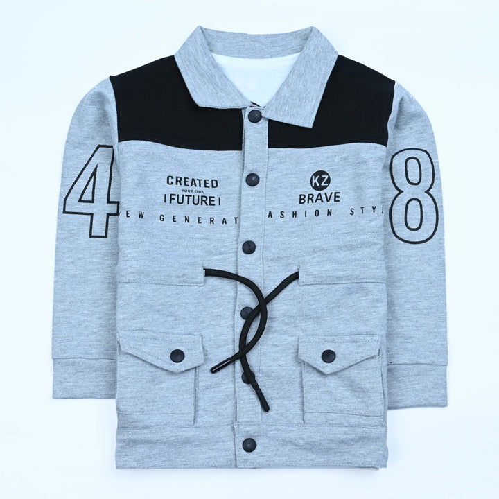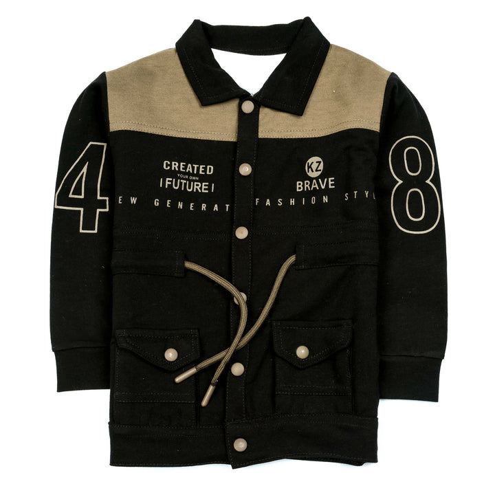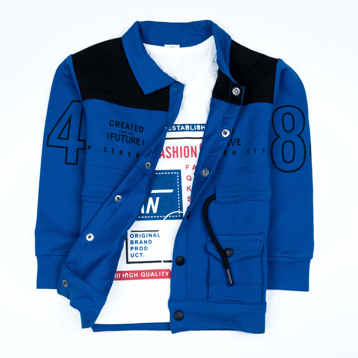 Set Includes: Stylish button-up jacket, printed t-shirt aur trouser with pockets