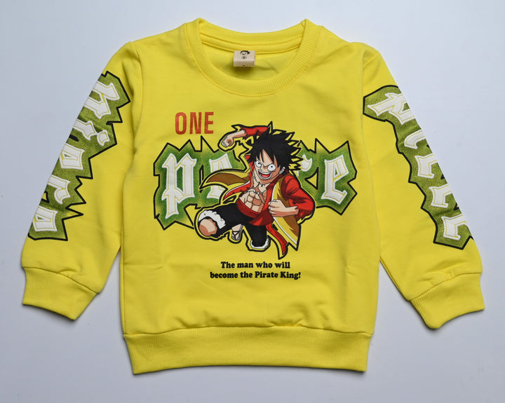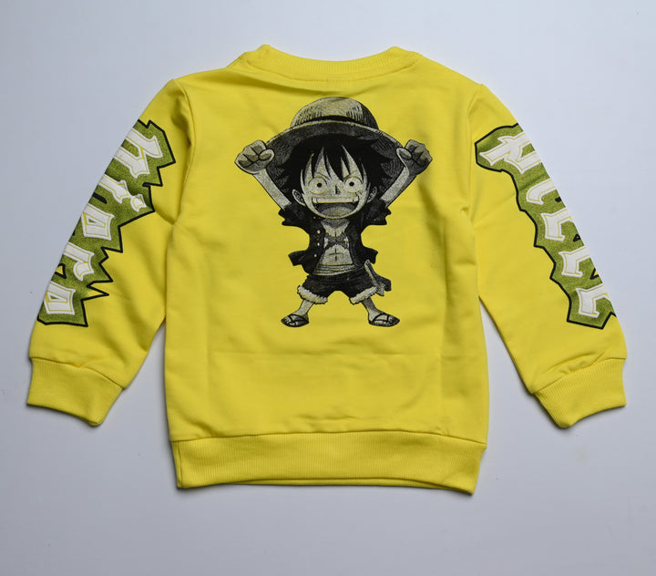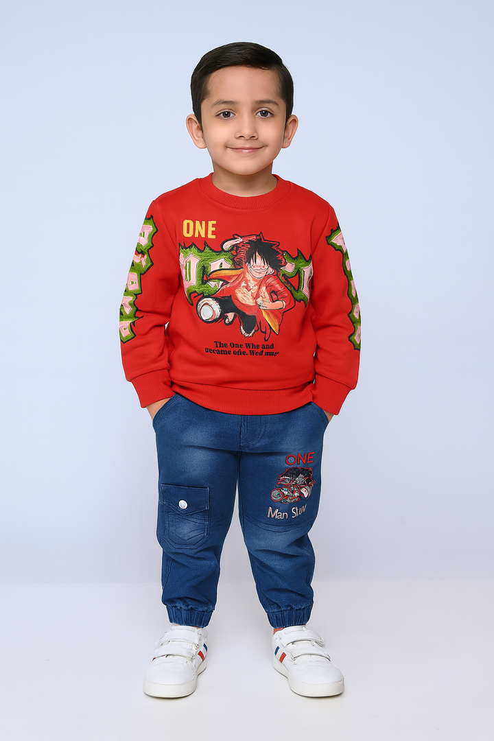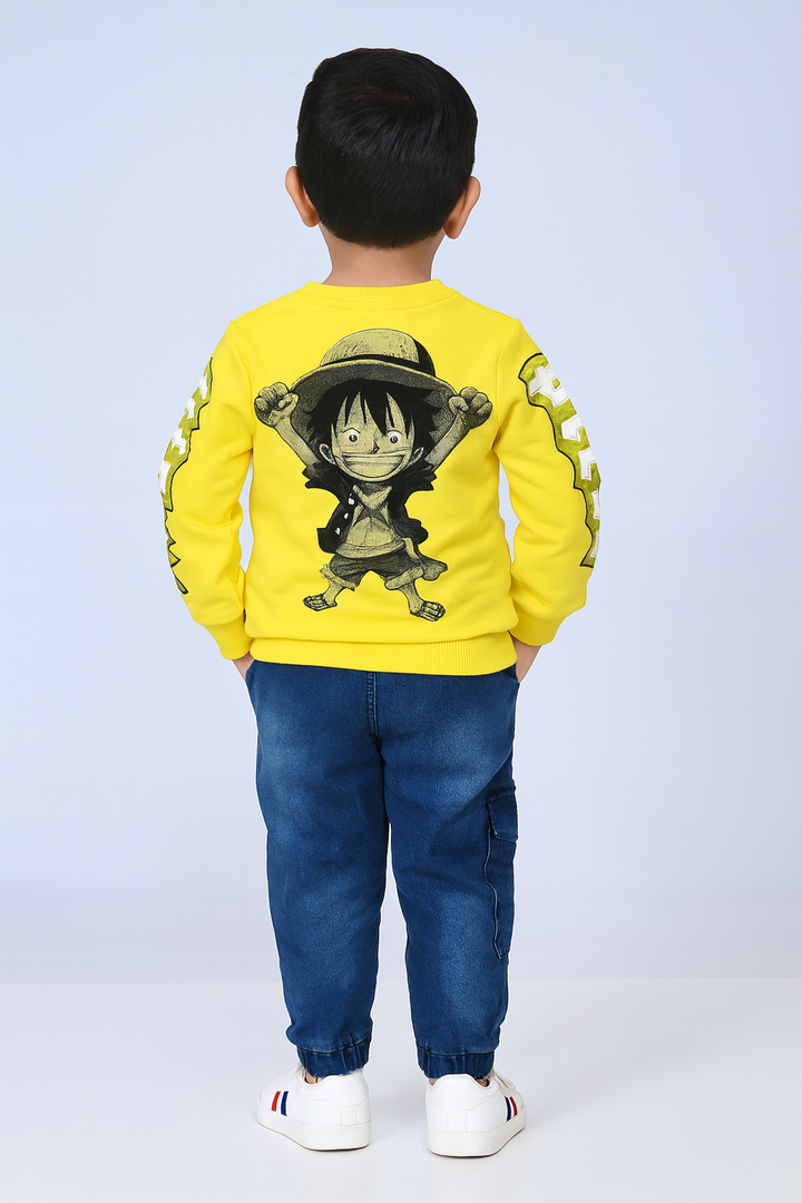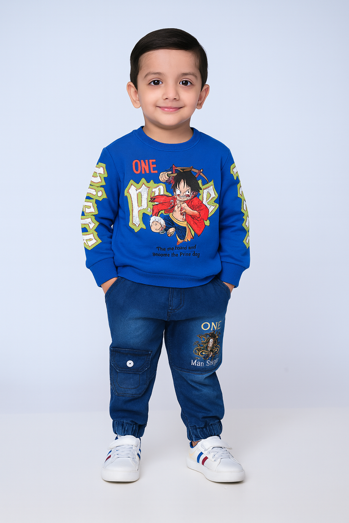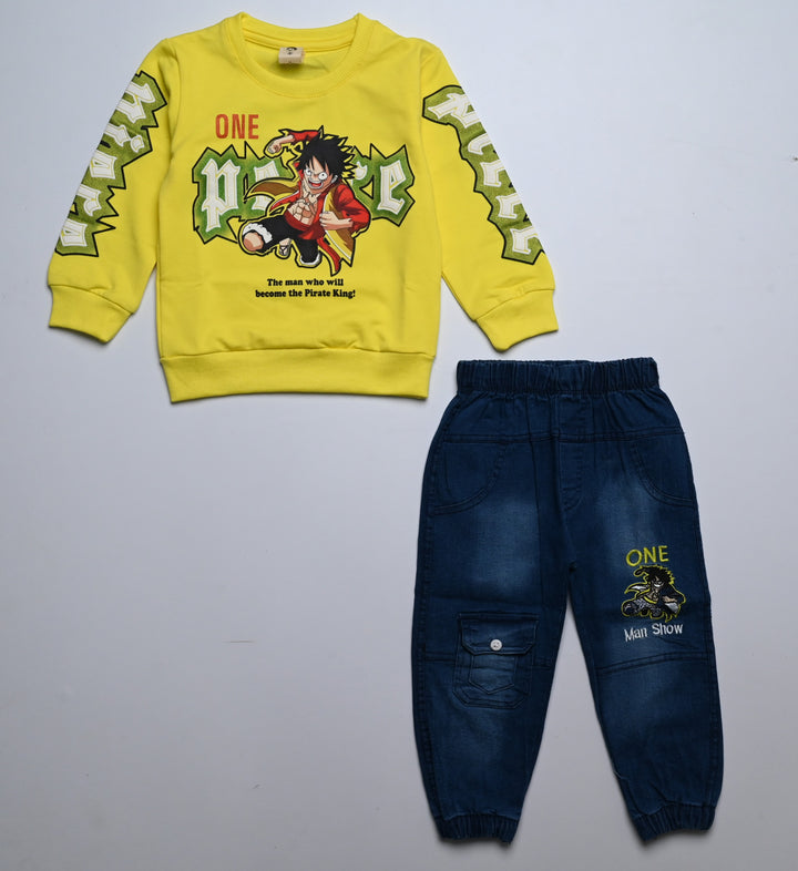 Bring fun and fashion together with this vibrant boys’ outfit set! Featuring a bright yellow sweatshirt with a bold anime print inspired by One Piece, this top adds playful energy to any day. The matching blue denim jogger pants offer comfort and durability with side pockets and trendy prints — perfect for active little explorers.