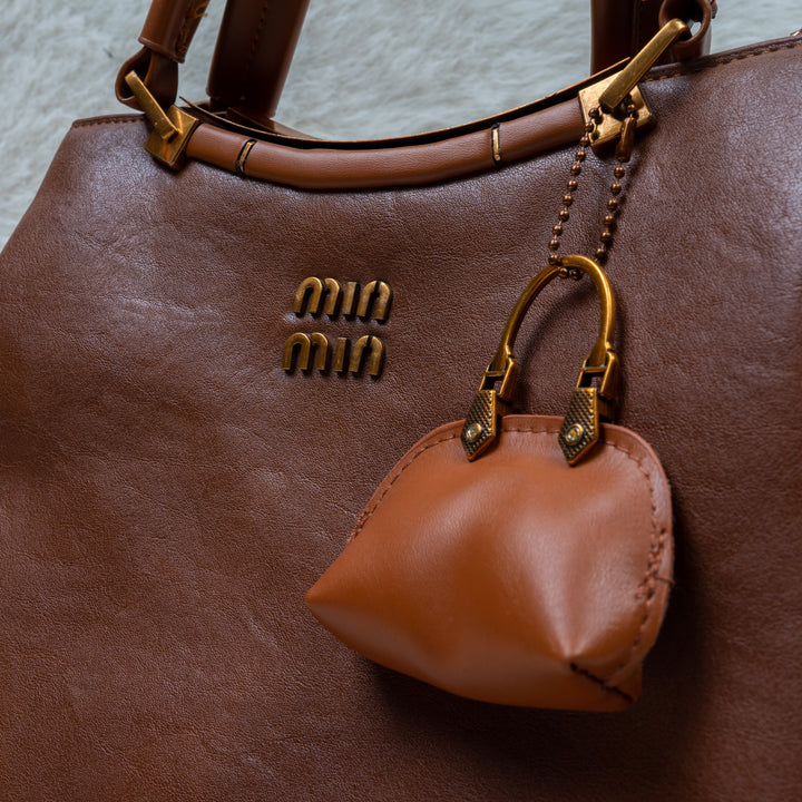 Adorable Bag Charm: A delightful, small, matching brown miniature handbag charm hangs from the handle, adding a playful and high-end accessory detail.