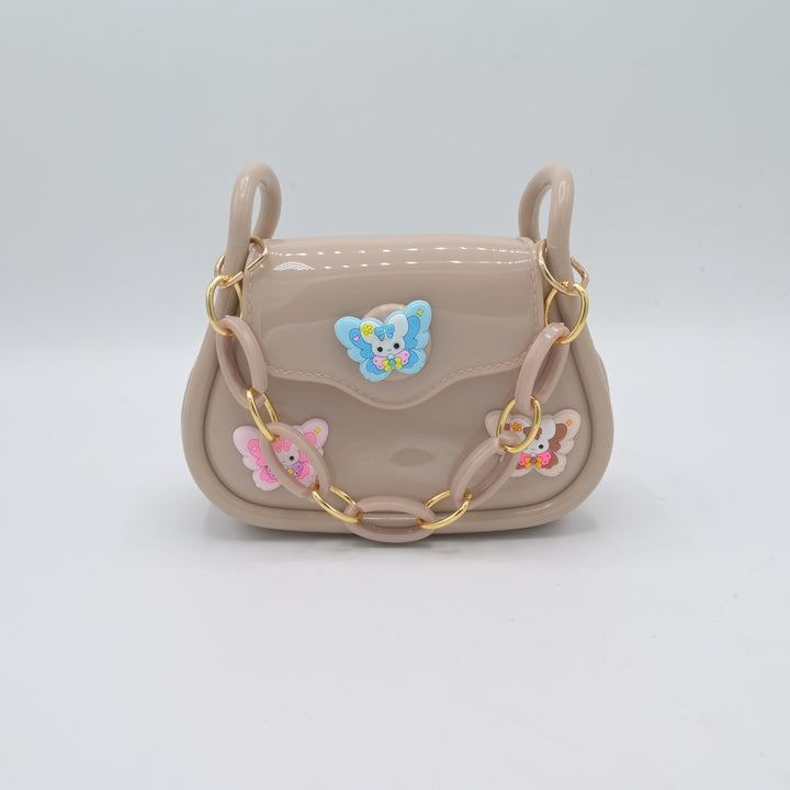 Add a touch of playful charm to your little one’s outfit with this adorable black glossy mini handbag. Designed with a stylish patent finish, it features colorful butterfly embellishments in blue, pink, and purple for a fun and trendy look. The chunky gold-accented chain strap adds a modern twist, making it perfect for both casual outings and special occasions.