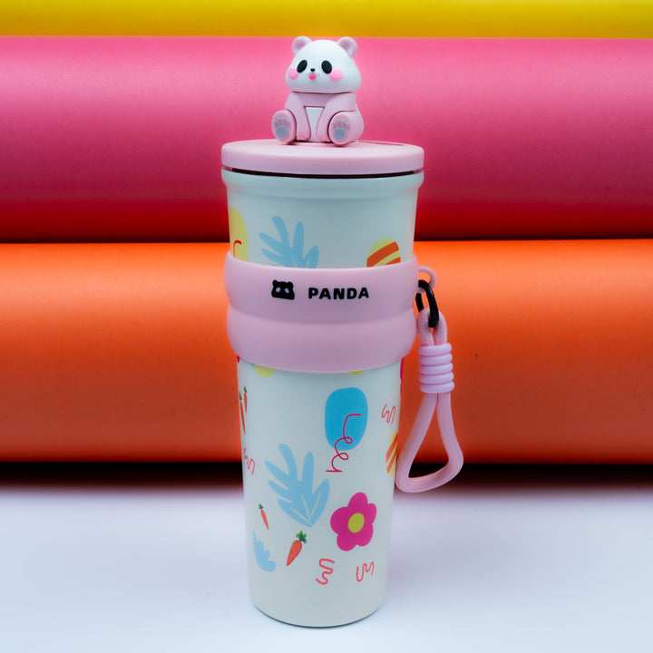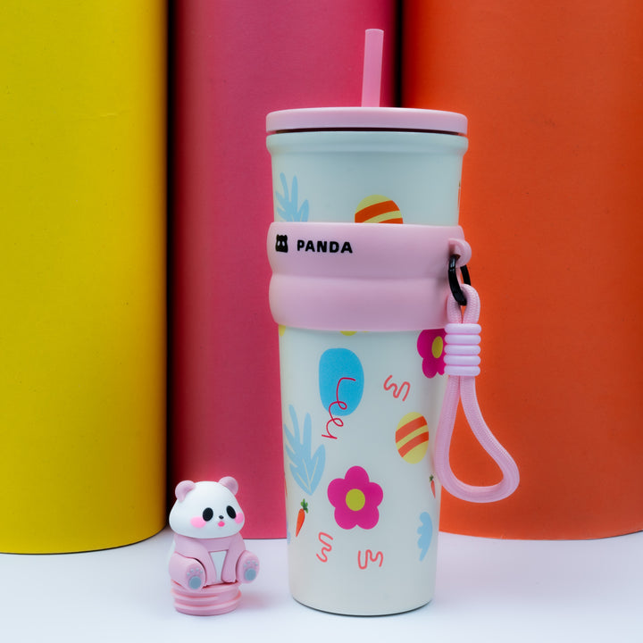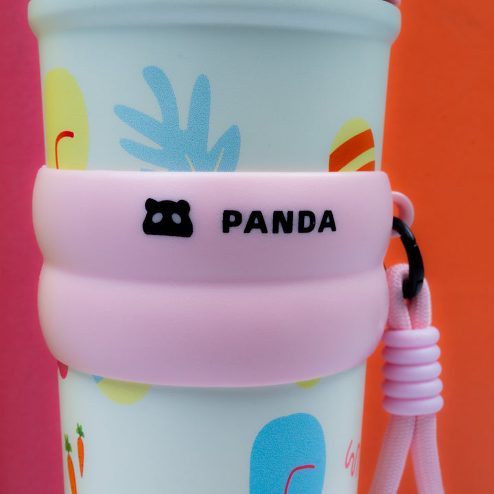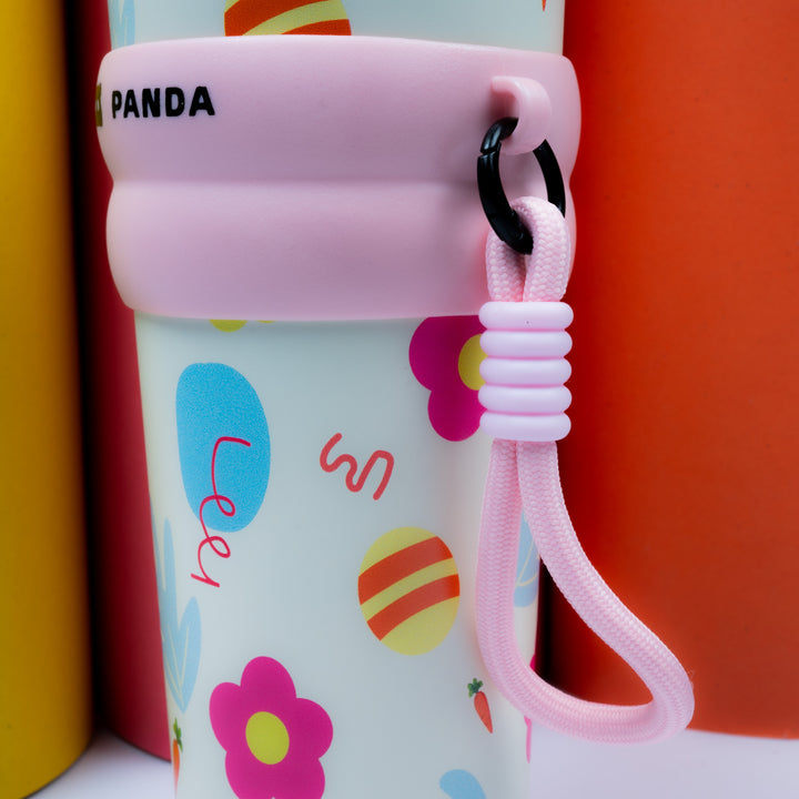 Designed with a soft pastel color palette and cute flower and carrot patterns, this tumbler features a silicone panda grip band and a matching carry strap for easy handling.