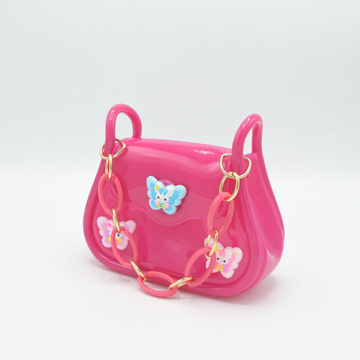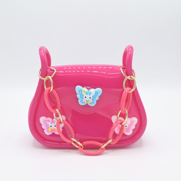 Add a touch of playful charm to your little one’s outfit with this adorable black glossy mini handbag. Designed with a stylish patent finish, it features colorful butterfly embellishments in blue, pink, and purple for a fun and trendy look. The chunky gold-accented chain strap adds a modern twist, making it perfect for both casual outings and special occasions.