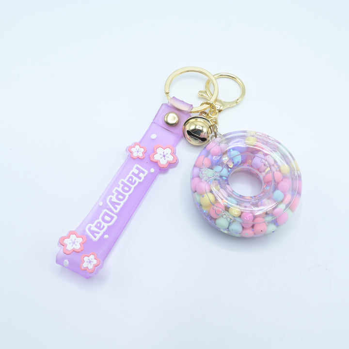 Make every day a happy one with this Happy Day Donut Keychain — a fun and colorful accessory that brings instant cheer to your keys or bags! The donut-shaped charm is filled with floating pastel beads that move playfully inside the clear design, creating a cute bubbly effect. The lilac “Happy Day” silicone strap with floral details and a tiny golden bell completes the joyful look.