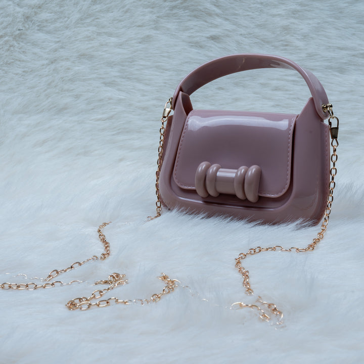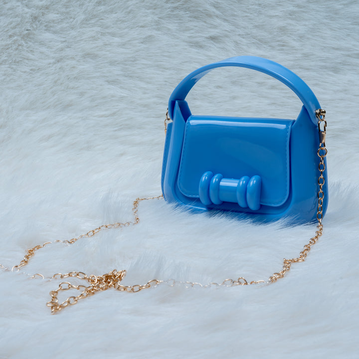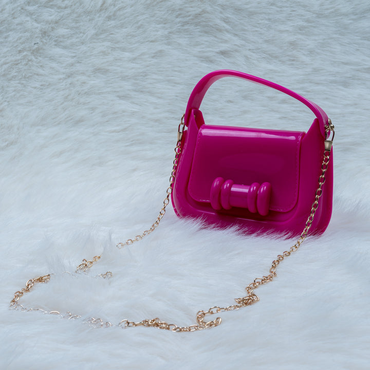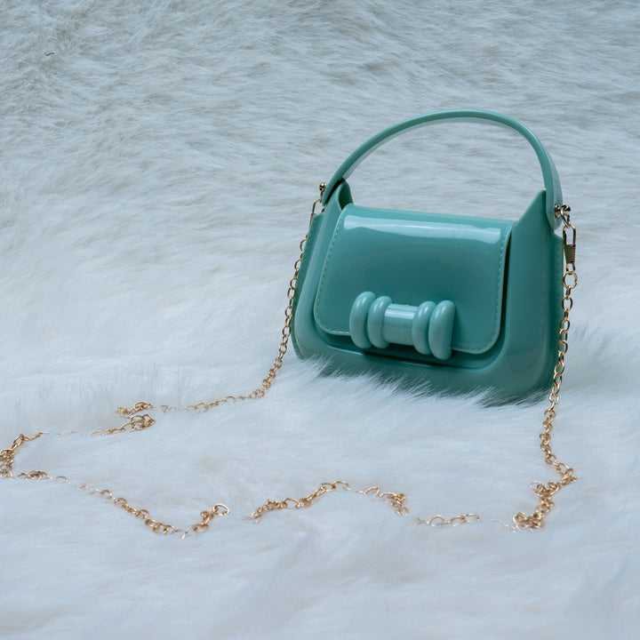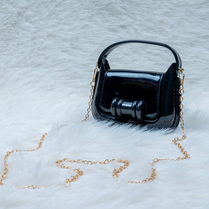 This glossy black mini handbag is the perfect accessory for stylish young girls. Its sleek design features a unique front buckle detail and a smooth top handle for a classy touch. Paired with a delicate gold chain strap, it can be worn crossbody or over the shoulder, making it ideal for both casual outings and special occasions. Compact, trendy, and durable — this handbag adds a sophisticated charm to any little fashionista's wardrobe.