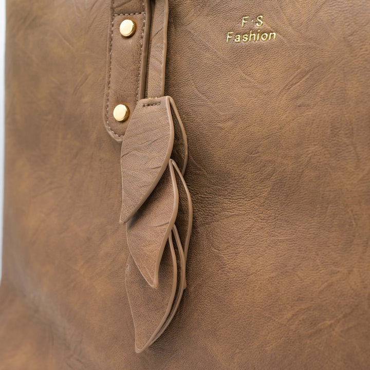 Add timeless sophistication to your look with this elegant light brown handbag by FS Fashion. Crafted from premium-quality faux leather, it features a soft texture with a natural finish and gold-tone accents for a chic touch. The spacious interior offers ample room for daily essentials, making it perfect for both work and casual outings. The decorative leaf charm adds a stylish flair to your ensemble.