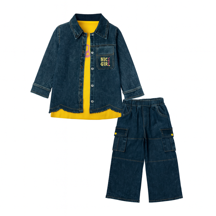 Upgrade your little girl’s casual look with this trendy 3-piece denim co-ord set. Designed for comfort and style, this outfit includes a soft cotton T-shirt, a button-down denim shirt jacket, and matching wide-leg cargo pants. The “Nice Girl” embroidered patch adds a fun, confident touch, making it perfect for school, outings, or casual family days.