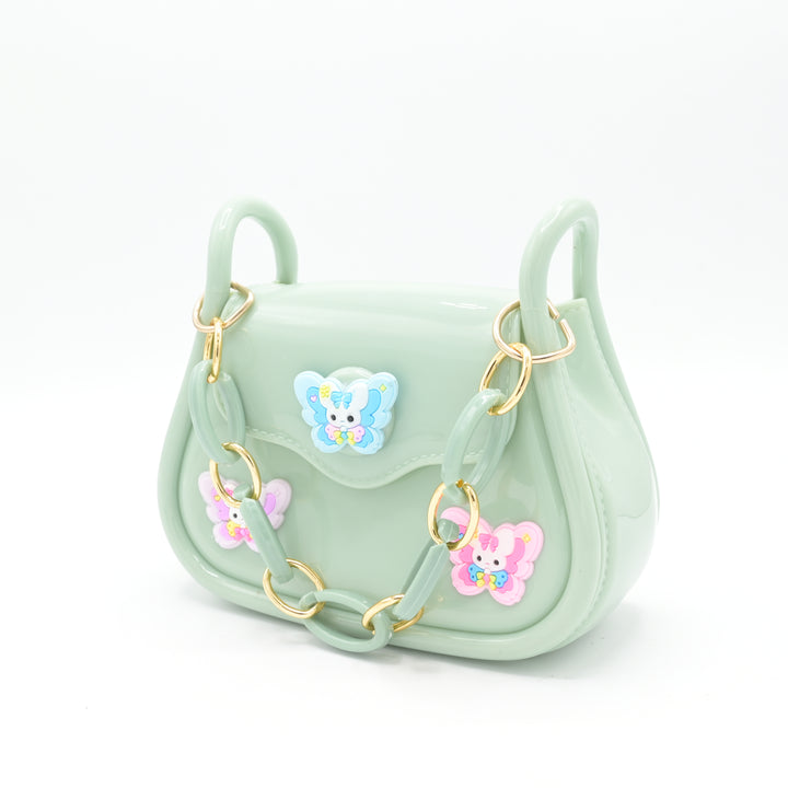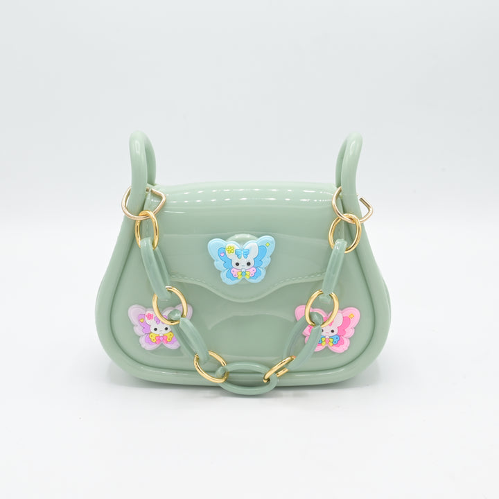 Add a touch of playful charm to your little one’s outfit with this adorable black glossy mini handbag. Designed with a stylish patent finish, it features colorful butterfly embellishments in blue, pink, and purple for a fun and trendy look. The chunky gold-accented chain strap adds a modern twist, making it perfect for both casual outings and special occasions.