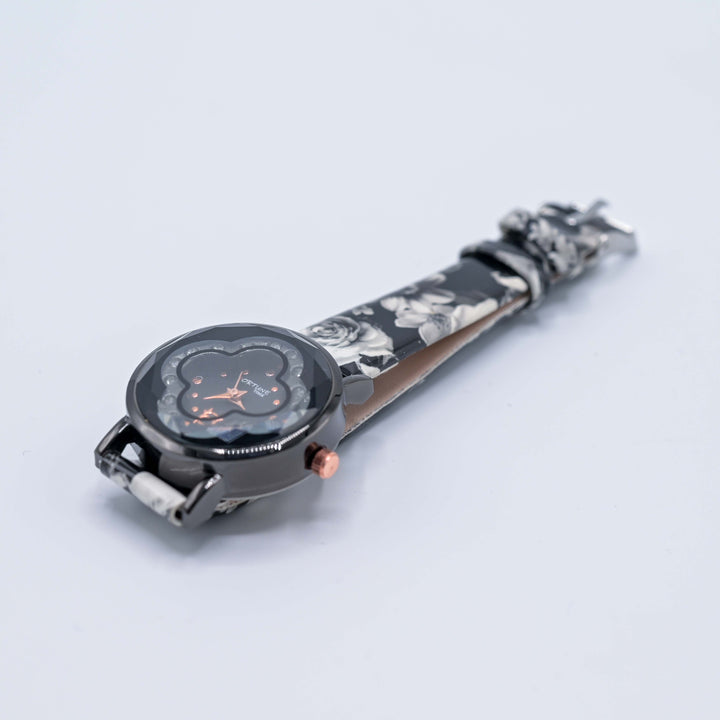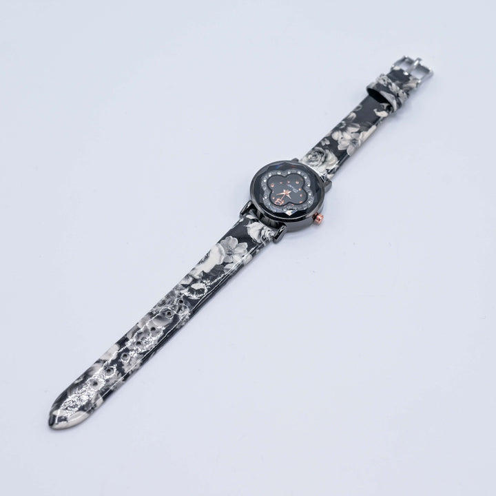Stylish black dial with floral-themed design