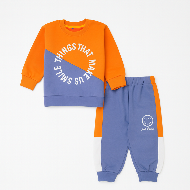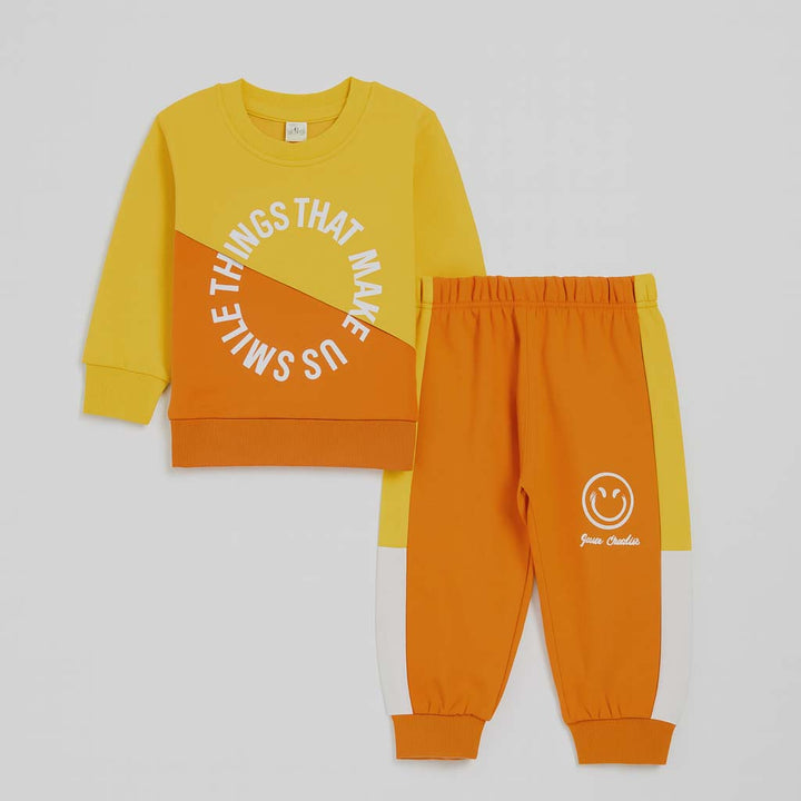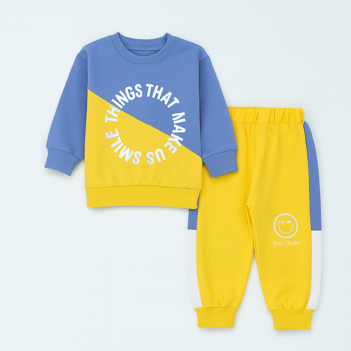 Bright, cheerful, and full of happy energy! This adorable two-piece outfit features a color-blocked sweatshirt in sunny yellow and orange, paired with matching jogger pants for the perfect everyday comfort look. The soft cotton fabric feels gentle on kids’ skin, while the bold “THINGS THAT MAKE US SMILE” print adds a fun, positive vibe.