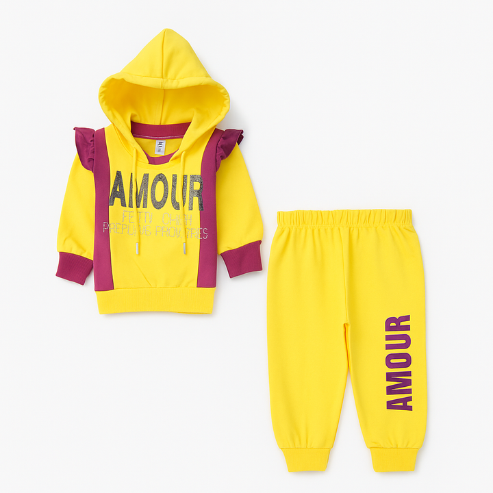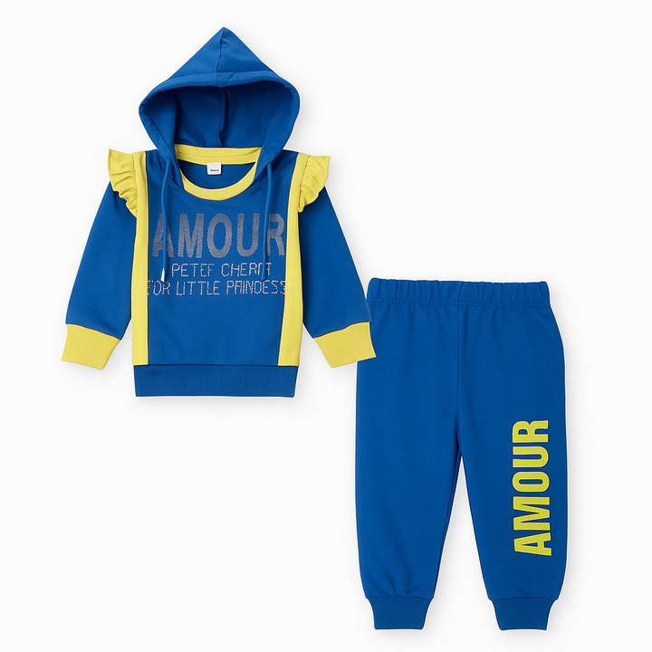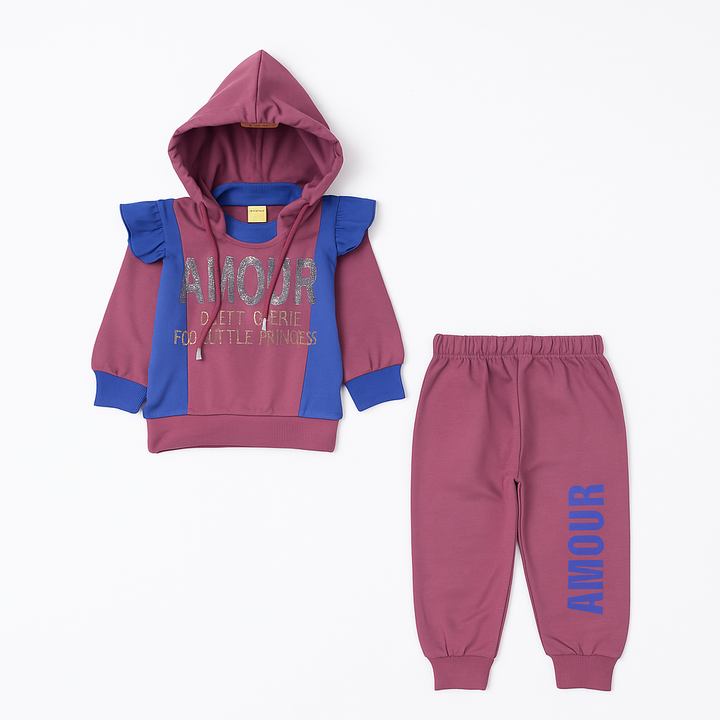 Let your little princess shine in this adorable Amour hoodie and jogger set. Designed in a charming mauve and royal blue color combination, this outfit features a glitter “AMOUR” print with ruffle shoulder detailing that adds a touch of playful elegance. The cozy hood and ribbed cuffs ensure warmth and comfort for all-day wear, while the matching joggers provide a perfect relaxed fit.