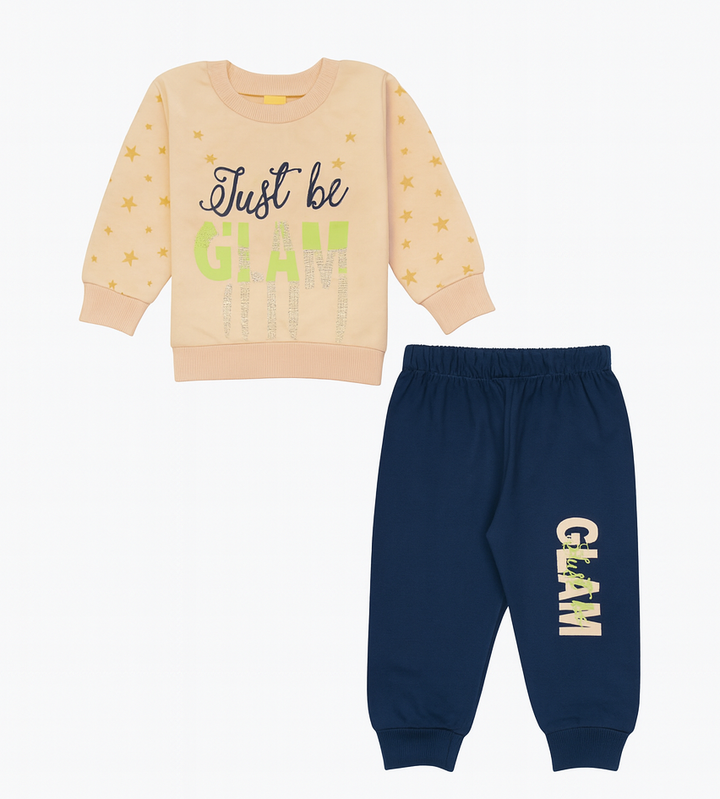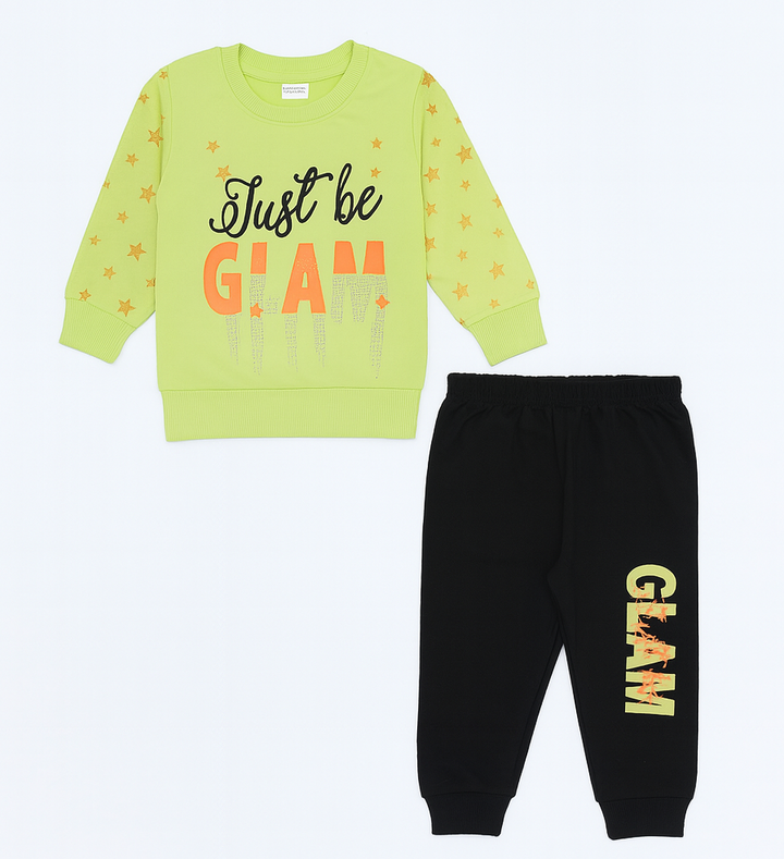 This stylish girls' sweatshirt and jogger set is the perfect blend of comfort and glam. The soft lilac sweatshirt features eye-catching orange stars on the sleeves and a glittery “Just Be Glam” print that brings fun, confident vibes. Paired with cozy black joggers featuring a matching “GLAM” print, this outfit is ideal for casual days, playtime, or outings.