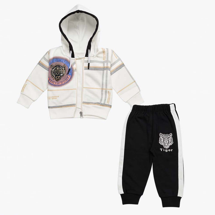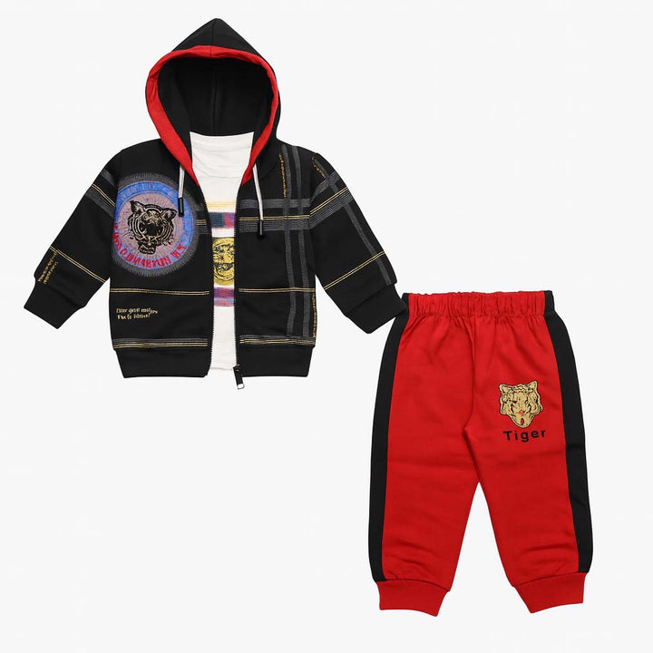 Unleash your little champ’s wild side with this Boys “Tiger Power” Tracksuit Set. The black hoodie features a fierce tiger emblem and contrast red inner hood for a cool streetwear vibe. Paired with bright red joggers and a comfy white T-shirt, this outfit delivers both comfort and confidence. Crafted from premium cotton-blend fabric, it ensures breathability, softness, and flexibility—ideal for school, playdates, or winter days.