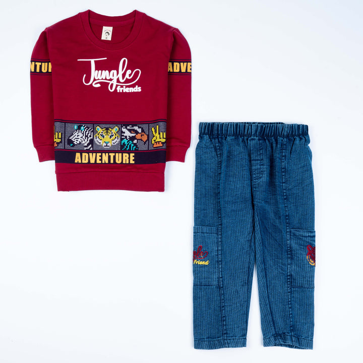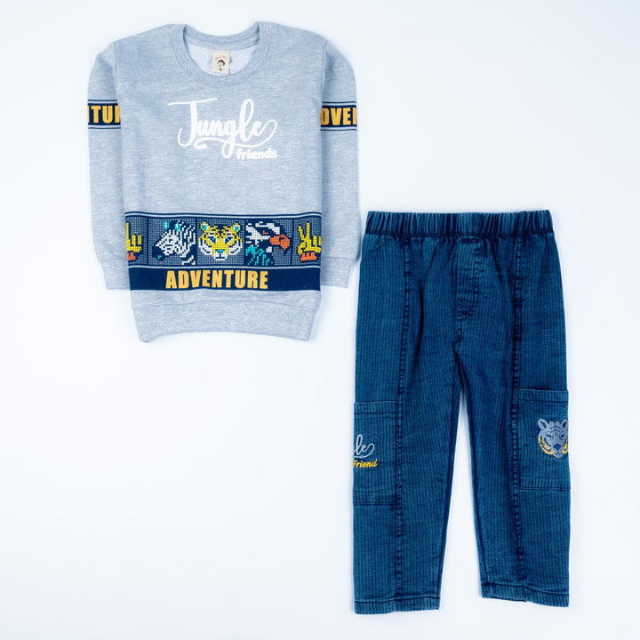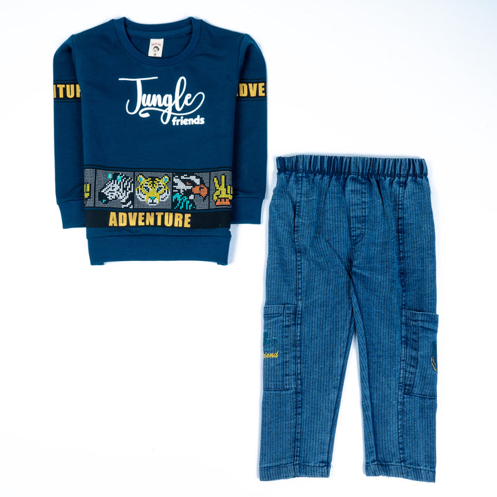 Let your little explorer step into adventure with this stylish “Jungle Friends Adventure” boys’ outfit set. The blue sweatshirt features fun jungle-themed prints and bold “Adventure” text, paired with comfortable blue cargo-style pants. Made from soft, breathable fabric with a relaxed fit, this set is perfect for playtime, outings, or casual days. Designed for comfort and style, it’s an ideal choice for boys who love fun and movement.