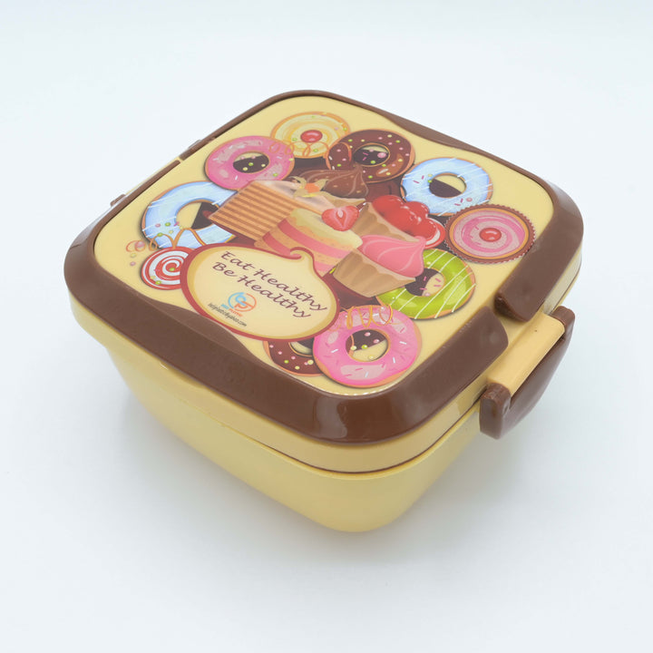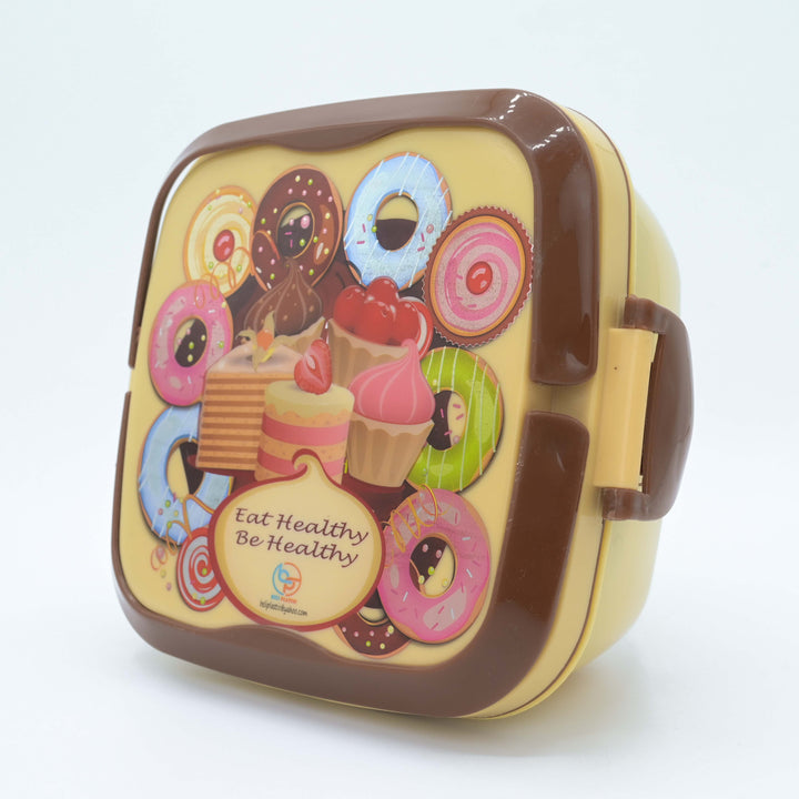 Make lunchtime sweet and fun with this Eat Healthy Be Healthy themed lunch box! Decorated with colorful donuts, cupcakes, and treats, this brown and beige lunch box is perfect for school, picnics, or snack time. Lightweight, safe, and designed for everyday use.