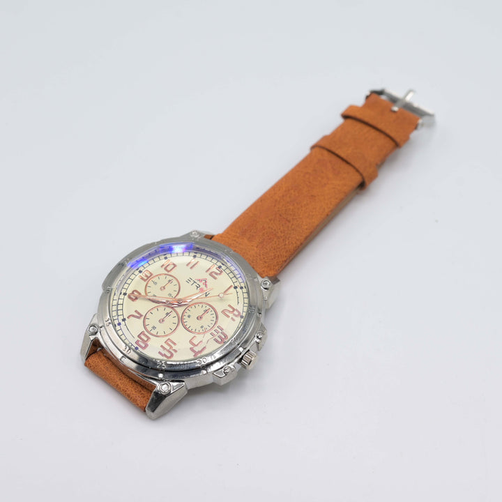Add timeless sophistication to your look with this elegant brown leather wristwatch, designed for men who value both style and substance. The soft textured leather strap offers a comfortable fit, while the silver metallic case and cream dial with bold red numerals create a refined and distinctive appearance.