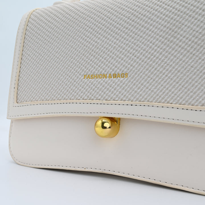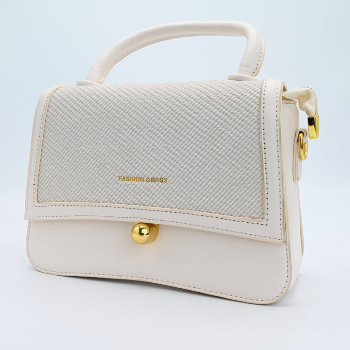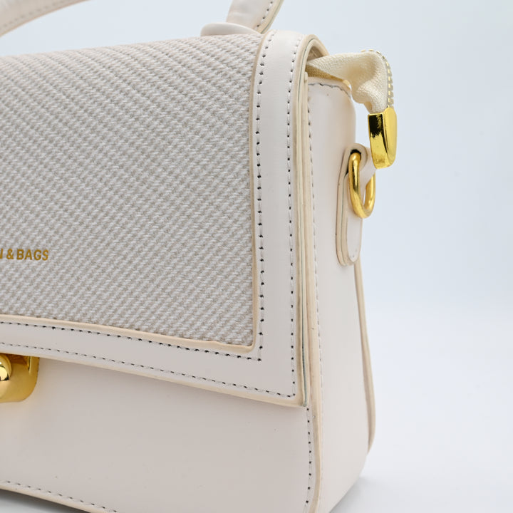 Add a touch of sophistication to your everyday style with this elegant off-white handbag. Crafted with a textured leather finish and accented with gleaming gold hardware, this bag combines modern fashion with timeless class. Its structured shape and top handle make it ideal for both casual outings and formal occasions.